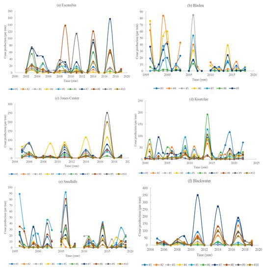 Cycles of cone production of individual trees at different sites (#1, 2…10 represent 10 sampled trees).