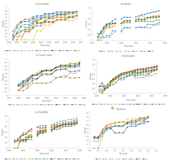 The entropy of cone production of each tree generally increased with time (Figure 2), but the entropy dynamics varied among trees. The sudden increase in cone production could bring down the entropy. Some trees had large deviations (e.g., #6 and #7 at Escambia). The increase in entropy on each tree with time is consistent with the previous results at the population level [23,24]. However, the dynamics of entropy varied among trees. The multiscale entropy of cone production was highly related to the biological regime [24]. This difference in regime at the individual tree level might be related to their varied microenvironmental conditions (e.g., soil water and nutrients) since these sites are across the southeastern region and have different climatic regimes. Intensive monitoring is needed to study the entropy dynamics at the individual and population levels [23].