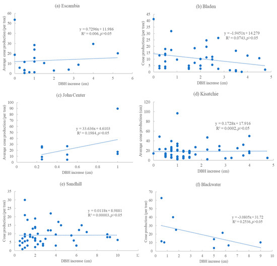Relationships between diameter growth and the corresponding average cone production over time across sites.