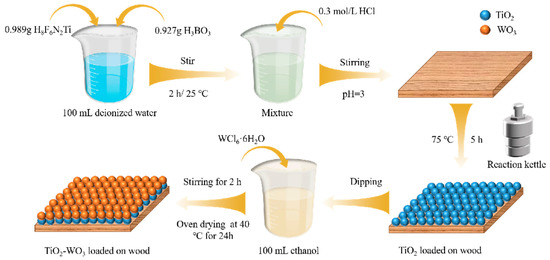 Schematic illustration of the preparation of TiO2-WO3 loaded onto wood.