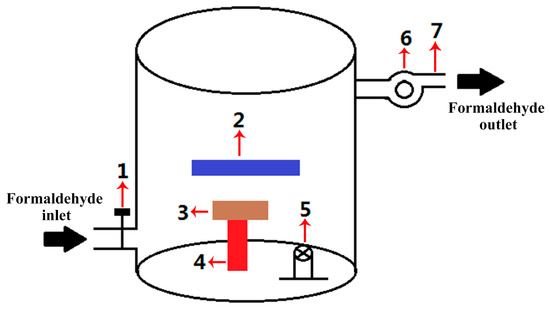 Schematic diagram of the experimental setup for photocatalytic degradation of formaldehyde. (1) Speedometer; (2) LED light; (3) wood sample; (4) support cantilever; (5) fan; (6) variable frequency suction fan; (7) formal wind speed.