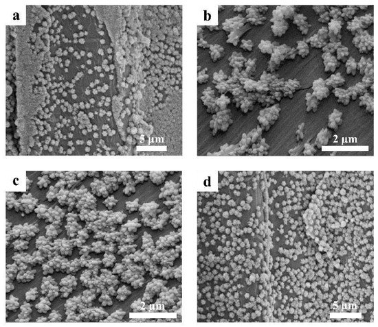 Figure 3 displays the SEM images of the as-prepared wood samples loaded with different proportions of TiO2-WO3. Figure 3a presents the microtopography of the surface of the TW1 samples; it can be clearly seen from the figure that tiny particles grow on the surface of the modified wood sample and cover the surface. These tiny particles are roughly spherical with many edges and corners. Figure 3b,c are the surface morphologies of TW2 and TW3. As shown in the figures, the surface of the samples is covered with small spherical particles, and some of them are agglomerated together. Moreover, the agglomeration phenomenon on the surface of the sample was more severe than that of the TW1 sample, and the particle size also increased. Figure 3d displays the SEM image of TW4, and the growth conditions of the nanoparticles on the surface are also similar to those in Figure 3a–c, but the particles are denser. However, the particle size is smaller than that in Figure 3a–c. Based on the above analysis, it can be inferred that the average particle size of TiO2 particles on the wood surface increases gradually with the increase in WO3 content. Furthermore, the agglomeration effect will also increase, but the addition of WO3 has little effect on the morphology of the product. The successful loading of TiO2-WO3 nanoparticles on the wood sample makes the wood surface form a dense metal oxide film structure, which is beneficial to improve the photocatalytic formaldehyde degradation performance of wood. More importantly, the surface microstructure of the wood did not change significantly after irradiation, suggesting that the surface-loaded nanoparticles only acted as catalysts.