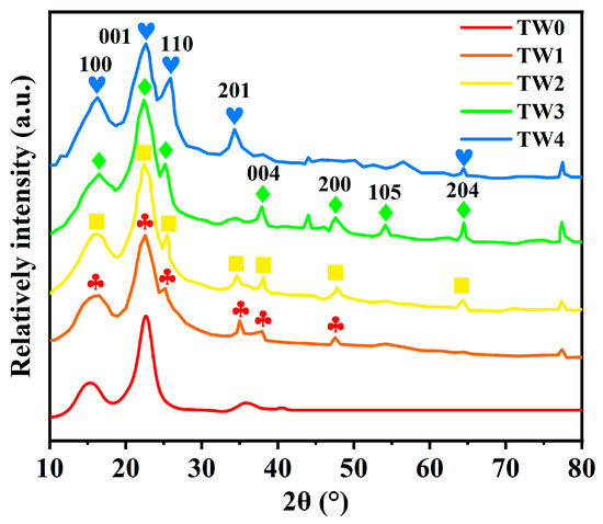 XRD patterns of TW0, TW1, TW2, TW3, and TW4.