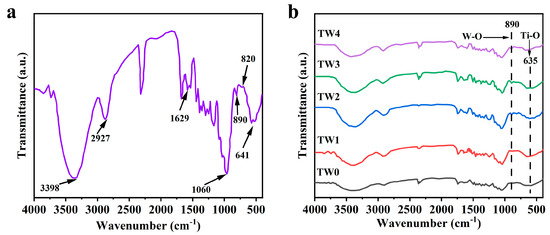 ATR-FTIR is a conventional test method for analyzing the functional groups, chemical structures, and binding mechanisms of samples. Figure 5 shows the spectra of the wood modified by TiO2-WO3. It can be clearly seen from Figure 5a that the vibrational absorption peak at 3398 cm−1 is caused by the hydrogen bond of the hydroxyl group (-OH) in wood or the stretching vibration of O-H in water [37]. This peak was enhanced after the modification, which may result from the hydrogen bond generated from the reaction of TiO2 or WO3 with the hydroxyl group on the wood surface. The absorption peak at a wavelength of 2927 cm−1 is caused by the asymmetric stretching vibration of the C-H bond in the long-chain group -CH3 in the wood [38]. The characteristic absorption peaks occurring at 1060 cm−1 and 1629 cm−1 are caused by C-O and C=O stretching vibrations in wood, respectively. The appearance of the above characteristic peaks showed that the wood did not destroy its unique structure of wood during the experiment [39]. Moreover, it can be seen from Figure 5b that TW1, TW2, TW3, and TW4 have W-O stretching vibration peaks at 820 cm−1 and 890 cm−1, which were not found in the TW0 absorption curve of the samples. Meanwhile, the Ti-O vibration peak appeared at the wavenumber of 641 cm−1, but it was not found in the spectrum of TW0. The spectrum indicated that the composite products of TiO2-WO3 appeared in TW1, TW2, TW3, and TW4, and were well loaded onto the wood surface. Meanwhile, the spectra of the irradiated wood did not change.