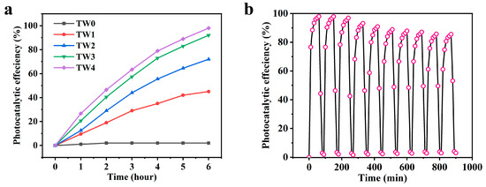 (a) Photocatalytic efficiency of formaldehyde of all samples. (b) Ten cycles of the photocatalytic efficiency of TW4 for formaldehyde.