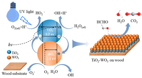 Based on the above photocatalytic results, we constructed the potential energy diagram and formaldehyde degradation mechanism diagram of the wood surface loaded with TiO2-WO3 composite material, as shown in Figure 7. When the treated wood is irradiated by ultraviolet light, the conduction bands (CB) of TiO2 and WO3 both generate excited electrons. Due to the potential difference, the photogenerated electrons in WO3 can easily move to the CB of TiO2. Therefore, electron transfer will reduce the chance of recombination with the holes formed in the valence bands (VB) of the TiO2 and WO3. The holes migrate directly from TiO2 to WO3 and then to the wood substrate interface. Thus, reduced recombination results in enhanced photoactivity. According to the previous references [41,42], Figure 7 and Equations (2)–(8) showed the photocatalytic degradation reaction of formaldehyde, where hv, h+, e−, •OH, and•O2− represent light energy, holes, electron, hydroxyl radicals, and superoxide radicals.