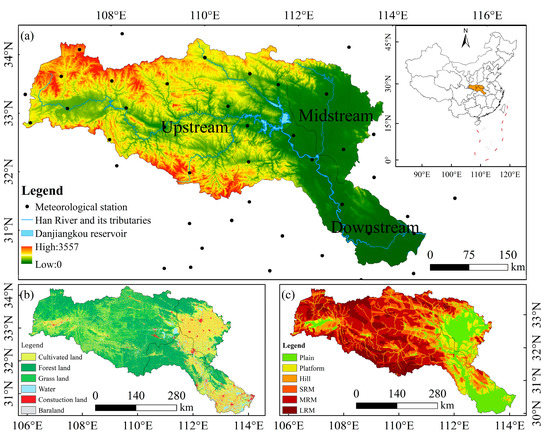 Geographical information of the study area: (a) Geographical location and elevation, (b) land-use types, (c) landform types.