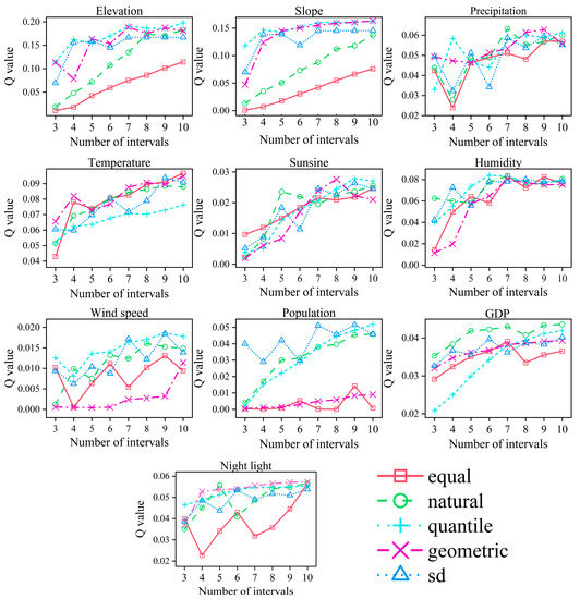 The purpose of optimal discretization is to discretize continuous variables into categorical variables. This study used the “GD” package of R programming to run the OPGD model [56]. Determining the optimal scale of spatially stratified heterogeneity through spatial data discretization is a crucial aspect of using the geographical detector. In this study, we used five discretization methods (equal, natural, quantile, geometric, and standard deviation) to convert continuous data into categorical data. Combining related studies [8,66,67] and the stability values observed in this study(Figure 2), the maximum number of stratifications was limited to 10, and a combination of the discrete method and the number of intervals with the highest q value was automatically selected for the final dispersion.