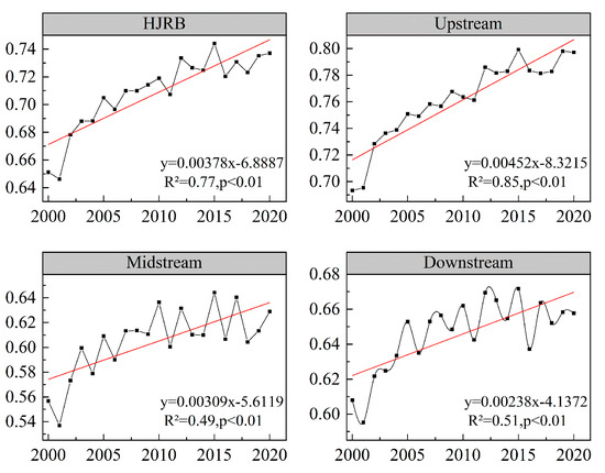 From 2000 to 2020, the interannual variation in the growing season vegetation in the HJRB showed a significant fluctuation and increasing trend (Figure 3), with an interannual growth rate of 0.00380/y, from 0.651 in 2000 to 0.737 in 2020; the lowest value appeared in 2001, and the highest value appeared in 2015. The multi-year growth rate is 13.21%, and the HJRB vegetation has been effectively improved in the past 21 years. Vegetation in different watersheds showed a fluctuating increasing trend in growing seasons, but specific differences existed. The overall trend was as follows: the upper reaches of the HJRB (4.52%/10a) > the lower reaches of the HJRB (3.09%/10a) > the middle reaches of the HJRB (2.38%/10a).