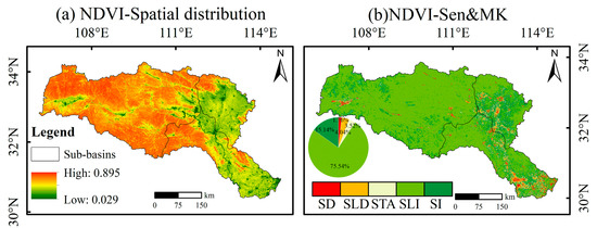 As can be seen from Figure 4a, the overall NDVI of the HJRB shows a spatial distribution pattern of “high in the northwest and low in the southeast”. The Theil–Sen median analysis combined with the Mann–Kendall test was used to divide the results into five categories: significant degradation (SD), slight degradation (SLD), stable (STA), slight improvement (SLI), and significant improvement (SI) (Table 2). Slight improvement and significant improvement occupy the most prominent positions, accounting for 74.54% and 15.14%, respectively; they are mainly distributed in forests, grassland, or forest protection areas in the upper HJRB, which are also the main implementation areas for ecological protection and restoration. The proportions of significant degradation and slight degradation are 1.76% and 4.04%, respectively, showing the characteristics of “surrounding points along the line”, concentrated in urban and riverside areas. In general, the vegetation coverage in the HJRB was in a better condition from 2000 to 2020, as the area of vegetation improvement was gradually increasing in this period, and the area of degradation was slowly decreasing.