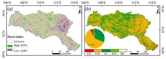 where H is the Hurst index; is the extreme deviation series; is the standard deviation series; m is a constant with the value of 1; is the cumulative deviation; (t = 1, 2, …, n) is the NDVI time series; (T = t, t + 1, …, n) is the mean value series.