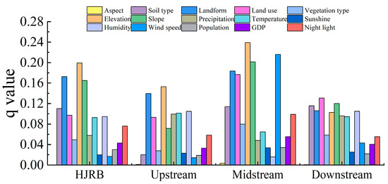 The factor detection results showed that all factors had significant explanatory power (p < 0.01), indicating that basic topographic factors, climate change and human activities significantly impacted the spatiotemporal dynamics of NDVI in the HJRB. As shown in Figure 6, the order of explanatory power of each factor in relation to NDVI was elevation (q = 0.1979) > landform (q = 0.0.1720) > slope (q = 0.1647) > soil type (q = 0.1094) > temperature (q = 0.0972) > land use (q = 0.0945) > relative humidity (q = 0.0842) > night light (q = 0.0575) > precipitation (q = 0.0550) > vegetation type (q = 0.0493) > GDP (q = 0.0414) > population density (q = 0.0321) > sunshine duration (q = 0.0284) > wind speed (0.0150) > aspect (q = 0.0031). Except for aspect, the explanatory power of all the basic topographic factors was higher than 0.16. The basic topographic factors more strongly shape the vegetation in the HJRB, and elevation was the decisive factor.