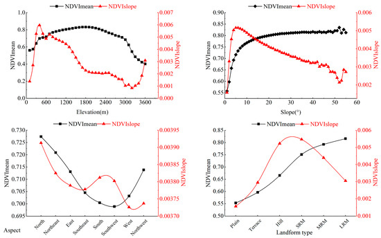Various factors influence vegetation growth, and topographic elements (elevation, slope, aspect, and landform type) affect vegetation growth by changing hydrothermal conditions in the local area. The trends of NDVI of vegetation under different topographic conditions were analyzed at intervals of 100 m elevation, 1° slope, 45° aspect, and first-class landform type (Figure 8). The average NDVI values show a characteristic of a “fluctuating increase followed by a sharp decrease” with increasing elevation. The NDVI growth rate increases sharply and reaches a peak when the elevation is less than 400 m; then, the NDVI growth rate decreases sharply, and when the elevation is greater than 3200 m, the NDVI growth rate rises again. The average value of vegetation NDVI increases with the increase in slope; at 0–53°, the NDVI growth rate rises sharply to the peak and then decreases slowly, and when the slope is greater than 53°, the NDVI growth rate fluctuates and increases. The mean NDVI values and trends of the aspect were best on the north aspect, and the shaded aspect received shorter sunshine duration than the sunny aspect, and was wetter with less evaporation, meaning the NDVI was higher. The variation in the NDVI of vegetation in different landform types showed obvious differences. The average value of vegetation NDVI increased with the uplifting of the landscape and was highest in large relief mountains (LRM). In contrast, the change in vegetation NDVI showed a “trend of increasing first and then decreasing”, with the rate of increase peaking in small relief mountains (SRM) and then decreasing.