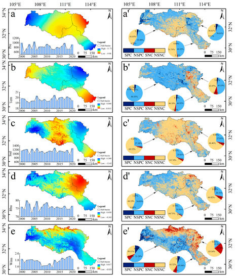 Spatial distribution of the correlation between NDVI and climate factors in the HJRB. PC: positive correlation, NC: negative correlation. (a–e): Spatial trend distributions of precipitation, temperature, sunshine duration, relative humidity, and wind speed, respectively. (a’–e’): Spatial distributions of correlation analysis and significance test of NDVI with precipitation, temperature, sunshine duration, relative humidity, and wind speed, respectively.