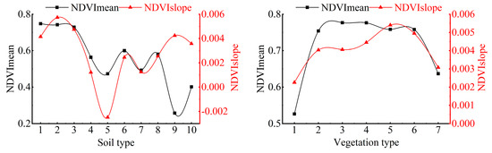Mean values and vegetation trends in the HJRB in relation to soil type and vegetation type. The number from 1 to 10 denotes 10 intervals in soil type, which are, respectively: semi-leached soil, leached soil, primary soil, semi-hydromorphic soil, hydromorphic soil, artificial soil, alpine soil, Ferralso soil, others, and water. The number from 1 to 7 denote 7 intervals in Vegetation type, which are, respectively: others, coniferous forest, broad-leaved forest, brushwood, grass, meadow, and cultivated plant.