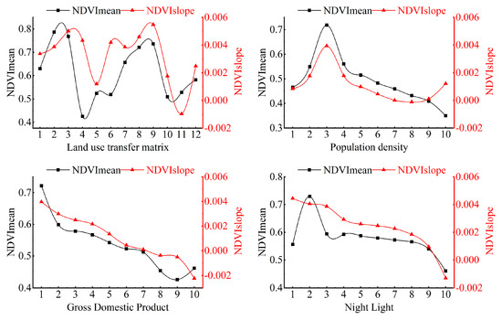 According to the optimal parameter combination, the NDVI mean value and change trend statistics under the classification of population density, GDP, and night light can be determined (Figure 11). The average values and change trends of the NDVI of vegetation showed an increase, and then a decreased with the increase in population density, and the change trends of NDVI showed a decrease with the increase in GDP and night light index.