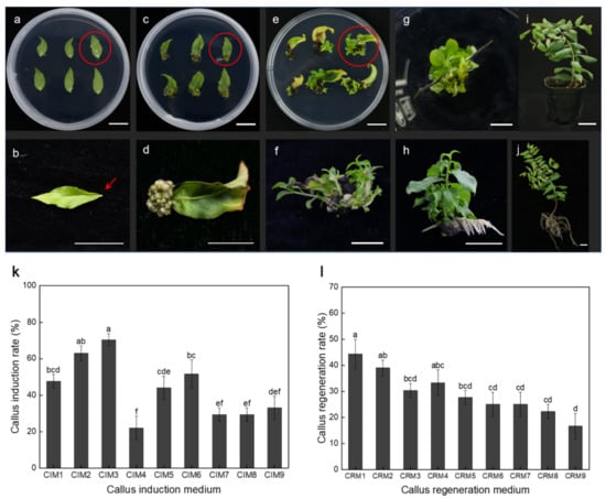 In vitro regeneration system of Lagerstroemia indica from whole leaf explants. (a,b) Whole-leaf explants for callus induction. (c,d) Induced callus from the whole-leaf explants. (e,f) Regeneration of shoots from the leaf calli. (g,h) Rooting of regenerated plantlets. (i,j) The rooted plantlets were acclimated to their environment, and then grown in the greenhouse. (k) Effects of cytokinin/auxin ratio on callus induction. (l) Effects of cytokinin/auxin ratio on callus regeneration. Scale bars = 1 cm (a,c,e,g,i), 2 cm (b,d,f,h,j). Different lowercase letters indicate significant differences at p < 0.05.