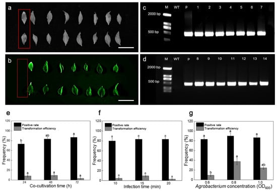 Evaluation of three factors affecting transformation efficiency. (a,b) Phenotype analysis of wild-type (red boxes) and transgenic plantlets under white light (a) and fluorescence (b). Scale bars = 2 cm. (c,d) PCR detection of the reporter gene eGFP in transgenic plantlets, with pBI121-GFP vector as a positive control (P) and wild-type plants as a negative control (WT). (e) Co-cultivation time, (f) Infection time, and (g) Agrobacterium concentration were found to differently affect the positive rate and transformation frequency of calli. Different lowercase letters indicate significant differences at p < 0.05.