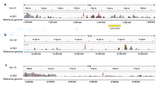 Next-generation sequencing provided the transfer DNA insertion site detection data. The red arrow indicates the T-DNA insertion site. The insertion of two T-DNA fragments was detected at the left boundary of chromosome 21 (a), and the right boundary of chromosome 22 in the overexpression OE1 (b), and the insertion of one T-DNA fragment was detected at the right boundary of chromosome 13 in the overexpression OE2 (c).