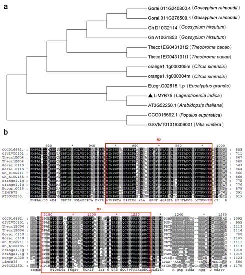Phylogenetic analysis (a) and multiple sequence alignment (b) of the LiMYB75 gene with MYB transcription factors from other species. Sequences of the MYB gene from A. thaliana, V. vinifera, T. cacao, E. grandis, P. euphratica, G. hirsutum, G. raimondii, and C. sinensis were downloaded from the Plant Transcription Factor Database. The two red boxes indicate the R2 and R3 domains, respectively.
