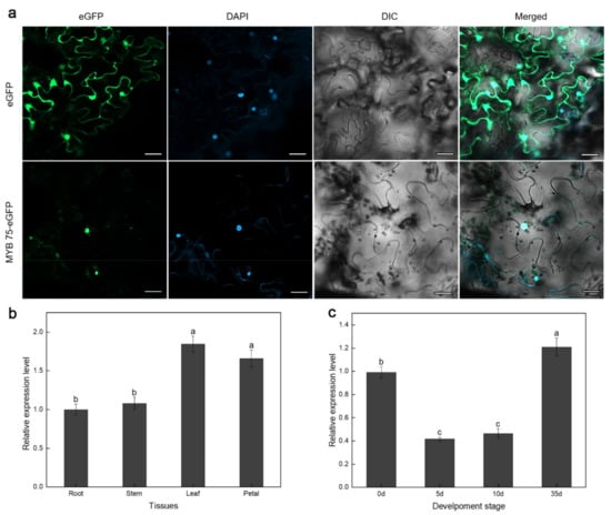 We assumed that the nucleus was where the LiMYB75 gene was located. We fused LiMYB75 with eGFP (35S::LiMYB75-eGFP) to study its subcellular distribution to support the hypothesis. As shown in Figure 5a, confocal images showed that in a transient expression assay, the LiMYB75-eGFP fusion protein was localized exclusively in the nuclei of Nicotiana tabacum leaf epidermal cells. The eGFP protein was located in the nucleus and cytoplasm as a control. LiMYB75′s nuclear localization is consistent with its predicted role as a TF.