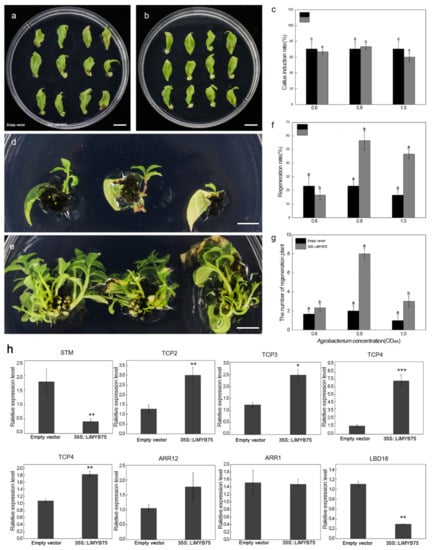 We hypothesized that the LiMYB75 gene aided the callus induction and regeneration processes. The ORF of LiMYB75 was transformed into wild-type crape myrtle under the control of a 2× CaMV 35S promoter to support the hypothesis. After 14 days of infection, there was no significant difference in the callus induction rates between the control mock and LiMYB75-overexpressing whole-leaf explants across three concentrations of Agrobacterium tumefaciens (Figure 6a–c). Surprisingly, the frequency of callus regeneration of the LiMYB75-overexpressing whole-leaf explants increased from 23.33% (OD600 = 0.6) to 56.67% (OD600 = 0.8) (Figure 6d–f). LiMYB75-overexpression levels also significantly increased the number of callus regeneration shoots by 8–9 plants (OD600 = 0.8) per piece (Figure 6e), which was much greater than the 1–3 shoots per callus regeneration with leaf infection simply using the empty vector (Figure 6d,g). Moreover, the phenotypes of the three LiMYB75-overexpressing lines did not significantly differ from the wild-type line (Supplementary Figure S4). These findings indicate that the LiMYB75 gene might be important for callus regeneration but does not affect L. indica development.
