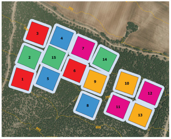 A total of 15 plots of 0.49 ha (70 × 70 m) were defined in late 2008 with a 10 m perimeter in which the same treatment was applied (Figure 2). Four silvicultural treatments were carried out at the beginning of 2009 in the plots of this 50-year-old forest stand, allowing three replicas of each of the four treatments. Once the site index of each of the 15 plots was determined, they were grouped into three categories (low, medium, and average), allotting one of each to each of the four treatments.