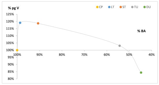 Figure 3 shows that light to medium silvicultural treatments cause a higher volume growth compared to the unmanaged stands in the CP. On the contrary, too intensive treatments can reduce this increase even below the growth of the CP stands. According to [35], the critical BA is defined as the basal area related to a 5% growth loss in volume with respect to the growth of the non-treated plots. This corresponds to a pg V of 95% in the vertical axis of Figure 3. Thus, Figure 3 shows that the critical BA is around 50% of the BA of the CP. Therefore, the DU intervention leads to considerable volume growth losses, at least temporarily.