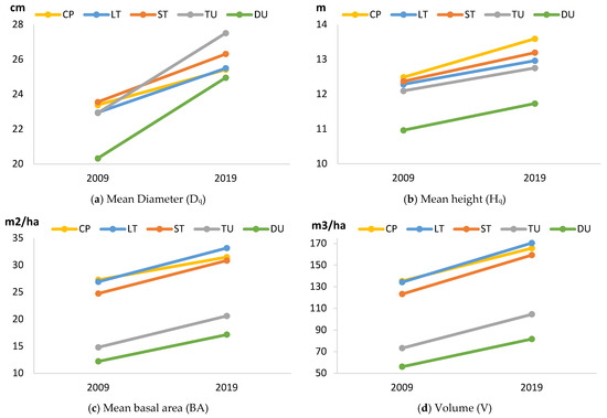 Alternatively, Figure 4 provides a visual interpretation of the data from Table 2. It represents the average of Dq, Hq, BA, and V in 2009 and 2019 for each silvicultural treatment. Figure 4 displays that there are no significant differences among treatments in terms of growth of Hq (4b), BA (4c), and V (4d), because the slope is similar. However, for Dq, there is a significant variation in the slope of the TU and DU treatments compared to the rest (4a).