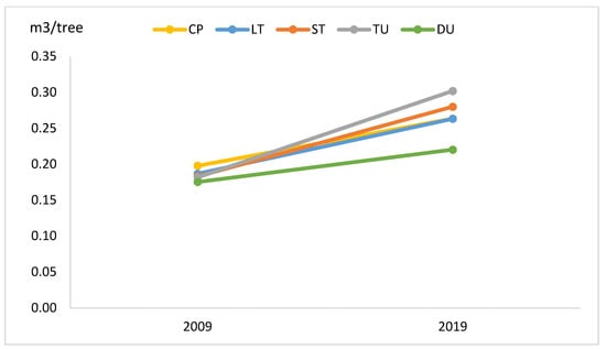 Changes in the unitary volume of the mean tree per treatment between 2009 and 2019.