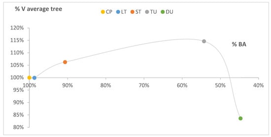 Figure 6 represents the relative variation in the unitary volume of each treatment regarding the corresponding magnitude in the CP stands (100%) against its respective BA value compared to the CP magnitude (100%). It shows that the stronger the treatment intensity, the higher the unitary volume of the mean tree. This can be explained by the fact that a density reduction implies a greater spacing among trees. This leads to a larger diameter growth and, therefore, a volume increase. However, a decrease in the unitary volume of the average tree in the DU treatment is appreciable (Figure 6). This occurs as the unitary volume is strongly influenced by the thinnest trees that remain standing, whereas the most vigorous trees are mostly removed. This is another sign that the DU treatment leads to a loss of quality and growth. Remarkably, the growth pattern within LT and CP plots for the unitary volume and the BA is very similar and relatively modest. Thus, LT does not considerably contribute to the stand growth and its resilience.