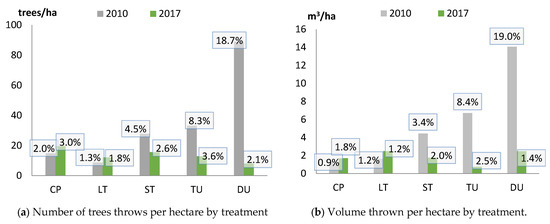 Finally, the comparison of both windthrows reveals that the damage caused by the 2010 one was far more significant (Figure 7). The lower losses of the 2017 event highlight the positive effect of the interventions on the stand stability. Thus, the period of eight years (2009) after the treatment application was enough to improve the average individual stability of the stand, reducing the susceptibility to windthrow. However, it can be seen that the impact of the windthrow in the lighter treatments (CP, LT) was much greater in the second weather event compared to the stronger ones (ST, TU, DU). In the first group of interventions, a larger stock was thrown in 2017 than in 2010. However, the opposite occurred in the strongly treated individuals: fewer trees were affected by the wind in 2017 than in 2010, that is, many years after the fellings.