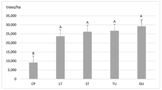 Figure 8 compares the different treatments’ juveniles (trees below 0.25 m). It notes that the seedling density in the control plots is significantly lower than the corresponding magnitude for the rest of the treatments. The average density of the control plots is lower than 10,000 trees/ha and that of the other treatments is around 25,000 trees/ha.