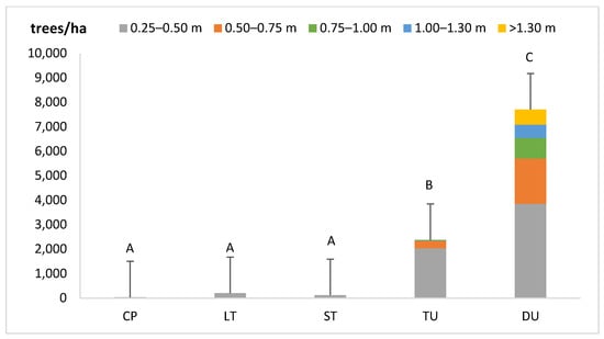 DU plots present the highest number of juveniles per hectare (7708/ha on average). In addition, 8% of regenerated trees display a height above 1.3 m. TU treatment plots present an average juveniles density of 2500 trees/ha, that is, less than 1/3 of the equivalent DU magnitude. It should also be recalled that most individuals are at most 0.75 m. This could be explained by the fact that the TU intervention aims for a gradual regeneration, allowing differentiated age classes over time [31], while DU management generates, in practice, a stand with 2–3 coexisting age classes. Nevertheless, DU promotes regeneration due to the extraction of the thickest trees, favoring light penetration.