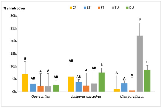 In the case of Quercus ilex, its highest coverage was noted in the CP, followed by DU- and LT-treated plots, while the lowest coverage was found in the TU and ST stands (Figure 10). Statistical differences were only found in the case of CP when compared to ST and TU plots. A certain similar pattern can be found in the cover of Juniperus oxycedrus. However, the highest coverage in this case appeared in DU plots followed by the CP and LT. The lowest coverage occurred in the TU and ST stands. A statistical difference was found between DU and ST trees.