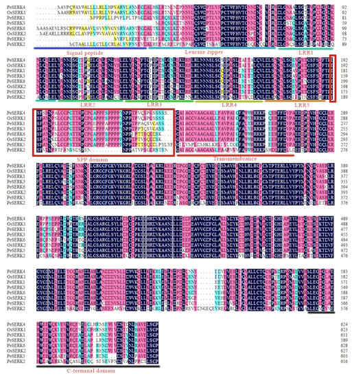 Comparison of SERKs in moso bamboo and rice. The signal receptor domain, transmembrane domain, intracellular kinase activity domain, SPP-motif and C-terminal domain are underlined.