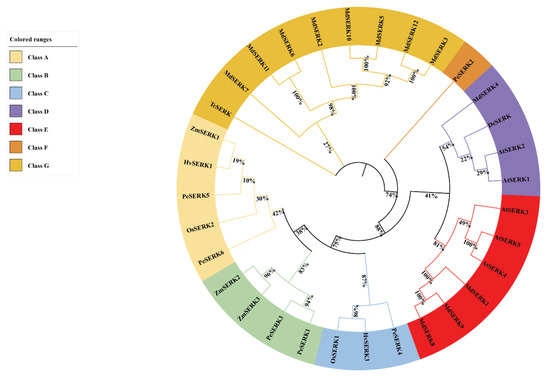 Somatic embryogenesis receptor-like kinases (SERKs), belonging to the leucine-enriched repeat receptor-like kinase Ⅱ family, are highly conserved in plants [1,2]. SERK proteins have four conserved domains: a signal receptor domain, transmembrane domain, intracellular kinase activity domain, and SPP-motif extension [3]. In 1997, Schmidt et al. discovered a gene encoding somatic embryos from the embryonic cells of carrot hypocotyl. The gene was named somatic embryogenesis-related receptor-like protein kinase gene (SERK), identified as the first SERK in plants [4]. SERKs have been reported in Oryza sativa (rice) [5], Arabidopsis thaliana [6], Triticum aestivum (wheat) [7], Hordeum vulgare (barley) [8], Zea mays (maize) [9], Theobroma cacao (cocoa) [10], Dendrobium officinale [11], Camellia sinensis [12], Solanum tuberosum (potato) [13] and Glycine max (soybean) [14]. Aan den Toorn et al. compared the amino acid sequences of the SERK proteins of monocot, dicot and non-vascular plants, and found that SERKs can be divided into four clades. The authors also established that monocot SERKs are more closely related to a member of the dicot SERK1-2 cluster [15].