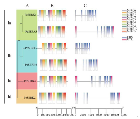 We constructed a phylogenetic tree with only PeSERKs to compare the gene structure and conserved domain distribution of homologous PeSERKs (Figure 3). PeSERK proteins were divided into four subclasses: Ia, Ib, Ic and Id, with 2, 2, 1 and 1 members, respectively (Figure 3A). Motif analysis (Figure 3B) and gene structure analysis (Figure 3C) indicated that their function may be similar. PeSERKs contained 11 exons, which is consistent with other plants, such as Dendrobium officinale [11], rice [5], soybean [14] and Arabidopsis [6]. Motif analysis revealed that except for PeSERK5, PeSERKs have 10 motifs. Each exon and its coding protein functional domains are almost in a one-to-one correspondence [45].
