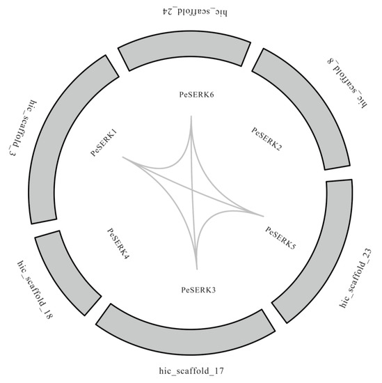 PeSERKs were distributed on six different scaffolds (Figure 4). Gene replication events are common in all species, they generate new functional genes and drive family expansion [46]. MCScanX genomic collinearity analysis was used to explore the repetition of PeSERKs. Six pairs of collinearity genes were detected (Figure 4). Except for PeSERK2 and PeSERK4, other PeSERK genes exhibited linear relationships (Figure 4).