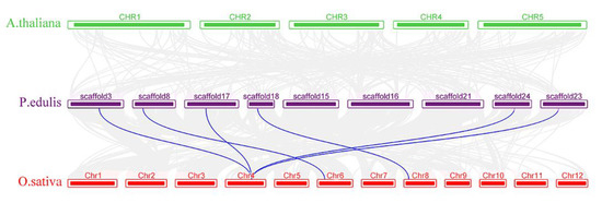 Syntenic relationships between PeSERKs in moso bamboo and SERK genes in two representative plant species. Gray lines in the background indicate the collinear blocks within P. edulis and other plant genomes. Blue lines indicate the syntenic SERK gene pairs.