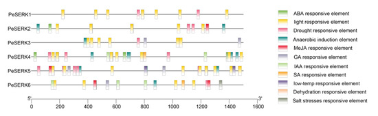 To understand the potential transcriptional regulatory mechanisms of PeSERKs, we analyzed the 1500 bp sequences of PeSERK promoter regions using PlantCARE [47]. We removed the unknown function elements and general transcription regulatory elements (Figure 6). The PeSERK promoter regions contain many light response elements, which may indicate that these proteins are involved in the plant response to light fluctuations. Moreover, the promoters of most PeSERKs also possess various cis-elements related to abiotic stress, such as ABA, MeJA, SA, drought, low temperature and salt stress responsive elements. PeSERK3, PeSERK5 and PeSERK6 have low temperature responsive elements, which may indicate that these proteins are involved in the plant response to light fluctuations. According to the evolutionary tree, PeSERK1 and PeSERK3 are highly homologous (Figure 3A,B). They contained similar cis-elements such as a drought responsive element, which suggests that they may be involved in resisting drought stress. The PeSERK gene family also has a variety of hormone-responsive elements, so PeSERKs may participate in the growth and development of moso bamboo via different hormonal regulatory pathways.