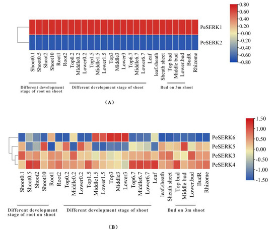 To study the expression pattern of PeSERKs in different tissues and the development stages in moso bamboo, we analyzed the expression of PeSERKs in 26 different tissues and development stages using bamboo transcriptome data (retrieved for SRX2408703). PeSERK1 and PeSERK2 showed the same expression trend in all tissues, PeSERK1 was highly expressed in different tissues, and PeSERK2 was poorly expressed in all tissues (Figure 7A), so PeSERK1 may play an important role in the development of all tissues in moso bamboo. PeSERKs can be divided into two groups (Figure 7B). The first group includes PeSERK6. The expression was higher for PeSERK6 than other PeSERKs in the middle of a 3 m bamboo shoot, with low expression in other tissues, so this gene might play important roles in the development of the 3 m bamboo shoot. The second group included PeSERK3, PeSERK4 and PeSERK5, which were expressed in different tissues and in different growth periods. PeSERK4 showed high expression in leaves, 0.5 cm shoots and 6.7 m bamboo shoots; PeSERK3 had a high expression in 0.1 cm shoots and lower buds; and PeSERK5 had a high expression in middle buds.