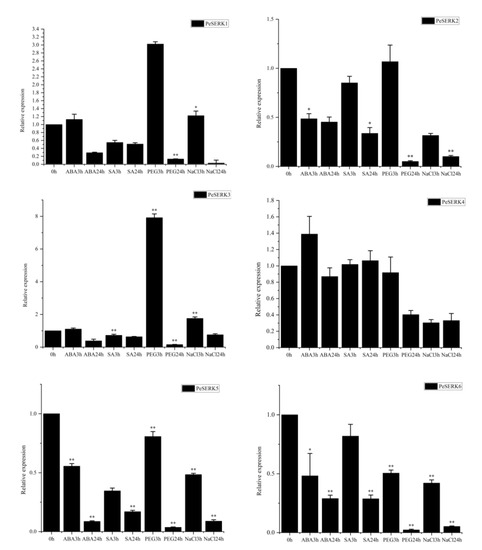 Expression levels of PeSERKs in moso bamboo under abiotic and phytohormone treatment. The expression of NTB was the internal control to standardize the RNA samples for each reaction. Data are the mean ± SE from three samples, * p ≤ 0.05, ** p ≤ 0.01.