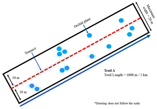 Samplings were carried along the existing and off-road four-wheel trails using the line-transect method designed at accessible trail(s) in the selected study sites and established randomly by selecting a point along the trail in each locality. To accommodate sampling in the large areas such as logging sites and skid trails, the study areas were calculated based on the distance travelled of each trail multiplied by the width of 5–10 metres on each side of the trail, as shown in Figure 2. Observers walk along lines and count all orchid plants observed within the specified width. The length, width, and number of transect plots were not fixed considering the topography, accessibility, time constraint, movement restrictions due to the pandemic, and budget. Due to the limitations, the comparative study focused on different forest types irrespective of the total size area. Square kilometre (km2) is used as the unit for total transect plots’ area for ease of density calculation, graph scaling, and plotting.