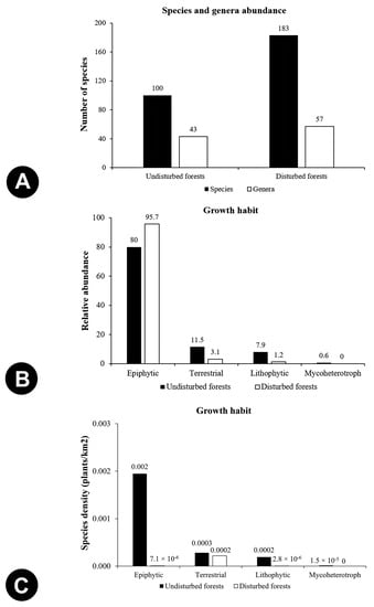 Comparison of species abundance and density between undisturbed and disturbed forests: (A) Species and genera abundance, (B) Relative abundance based on growth habit, (C) Species density based on growth habit.
