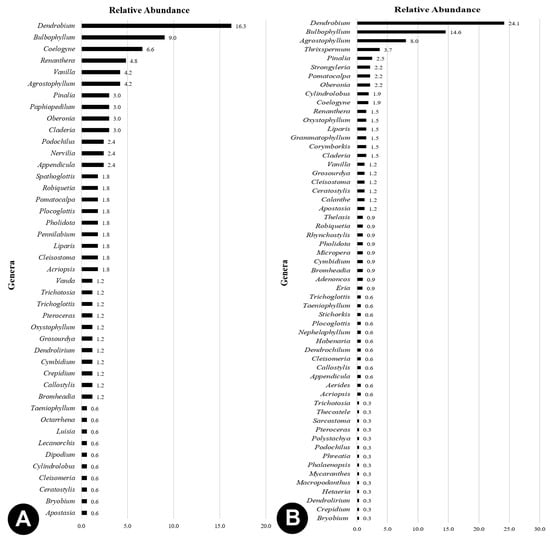 Species richness in the disturbed forests was 183 species with the logging sites harbouring the most abundant orchids species if compared to the undisturbed forests with 100 species (Figure 4A). Despite that, undisturbed forests had a higher orchid density (2.4 orchids) when compared with the disturbed forests (0.2 orchids). However, disturbed habitats, especially the logging sites, showed greater impoverishment than the undisturbed habitats as very few surviving plants were found or collected. Similarly, Agrostophyllum stipulatum was recorded with highest relative abundance in both undisturbed (3.6%) and disturbed forests (4.6%). The species composition of the orchids differed significantly in between undisturbed and disturbed forests. Disturbed forests comprised mostly epiphytic orchids (Figure 4B), of which the highest collection was from logging sites. Terrestrial species occurred the most in the undisturbed habitats. Only few to none were marginally more frequent in a more open and disturbed habitat. Additionally, species density of orchids based on growth habits was lower in disturbed habitats than in the undisturbed or pristine ones (Figure 4C). The two forest types were Dendrobium and Bulbophyllum as of the most abundant genera which were also mostly epiphytic (Figure 5).