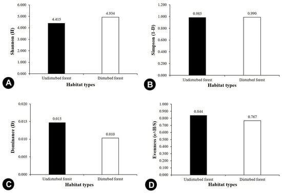Overall comparison of species diversity between the undisturbed and disturbed forests: (A) Shannon (H), (B) Simpson (1-D), (C) Dominance, (D) Evenness (e^H/S).