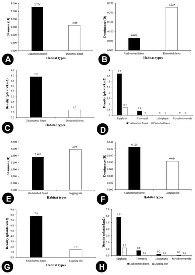 Comparison of species diversity and density for Adjacent Undisturbed vs. Disturbed Forests and Undisturbed Forests vs. Logging Sites: (A,E) Shannon (H), (B,E) Dominance (D), (C,G) Density (plants/km2) based on forest types, (D,H) Density (plants/km2) based on growth habit.
