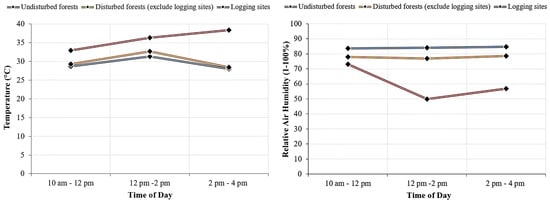 Daily course of temperature and relative air humidity in undisturbed and disturbed forests for different disturbance regimes in Peninsular Malaysia (2016–2020). Note: Each point represents means of period of day, morning (10 am–12 pm), afternoon (12 pm–2 pm), and late afternoon (2 pm–4 pm).