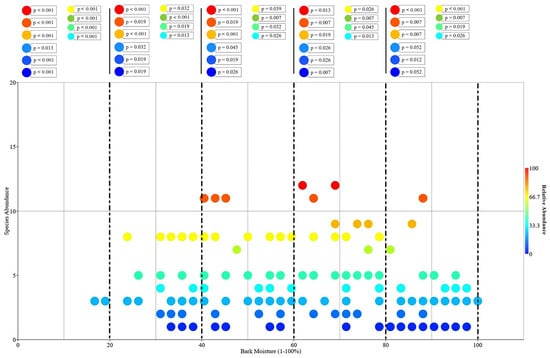 Relation between total epiphyte species density (species per tree) and host plants’ bark moisture (bubble plot; N = 150). According to their colour, cold to hot colour, bubbles reflect multiple values.